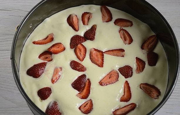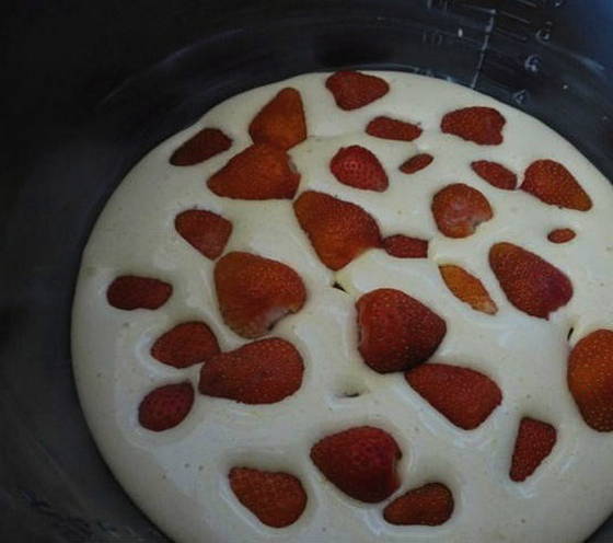 - Smeer de multicookerkom met olie en giet het deeg. Spoel en droog de aardbeien. Voeg vervolgens de bessen toe aan het deeg en leg ze voorzichtig neer.