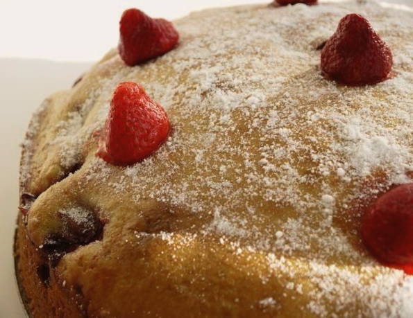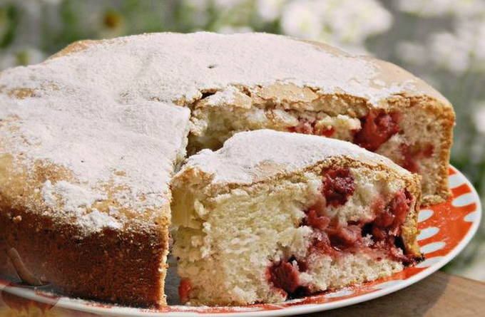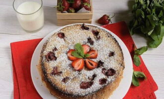 - Wij bakken Charlotte ongeveer 50 minuten op 200 graden. Als de cake klaar is, bestrooi met poedersuiker en garneer met aardbeien. Eet smakelijk!