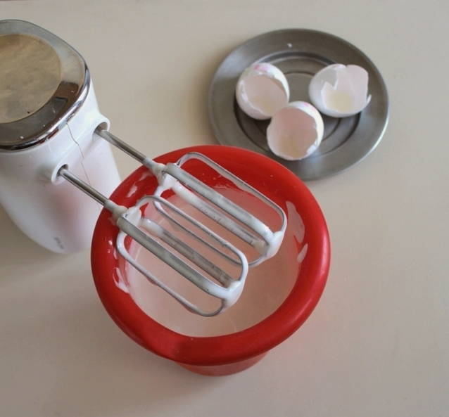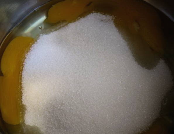 - Breek de eieren in een kom, voeg zout toe en klop grondig met een mixer op hoge snelheid. Voeg geleidelijk suiker toe, klop tot het luchtig is.