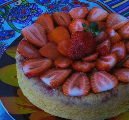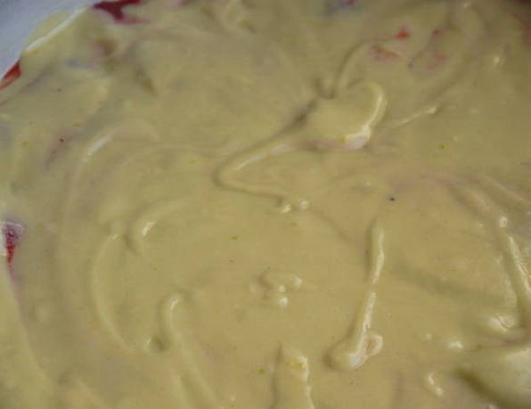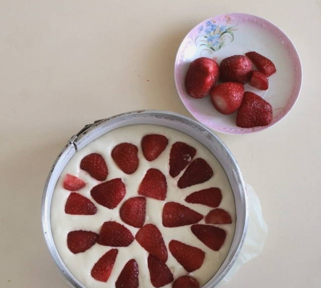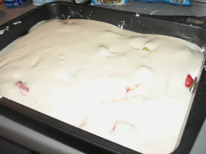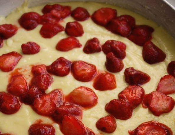 - Strooi bloem op de ovenschaal, giet ongeveer de helft van het deeg erin. Leg aardbeien op het deeg.
