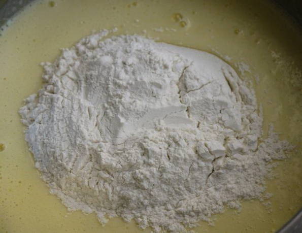 - Zeef de bloem met bakpoeder bij de eimassa en meng goed.