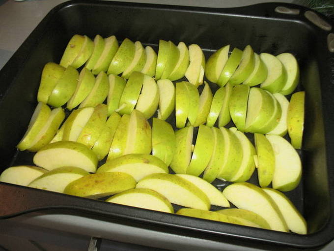 - Snijd de appels in partjes en leg ze op een ingevette bakplaat. Bestrooi ze met zetmeel en kaneel.