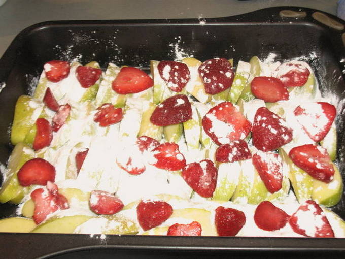 - Snijd de aardbeien in schijfjes en leg ze op de appels en bestrooi ze ook met zetmeel.