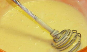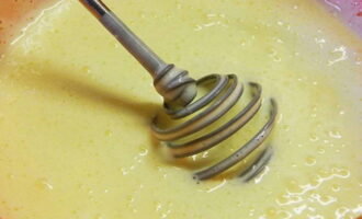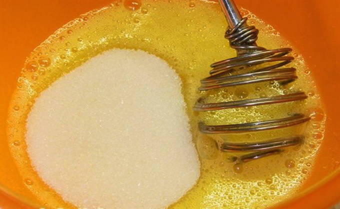 - Het deeg koken. Meng in een diepe kom de eieren met suiker en onderbreek met een mixer tot er schuim verschijnt.