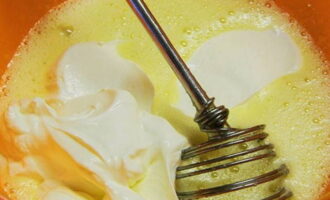- Laten we een deeg nemen. We rijden eieren in een aparte container, voegen zout en kristalsuiker toe - mengen en doen dan zure room en 100 gram gesmolten boter. We onderbreken voorzichtig alle componenten totdat er schuim ontstaat met een mixer of een garde.