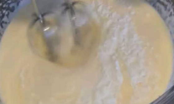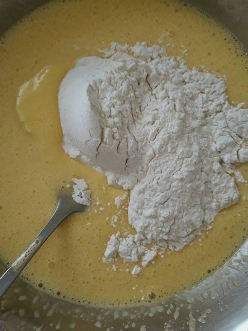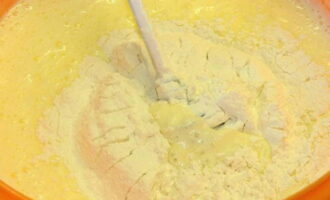 - Combineer de gezeefde bloem met bakpoeder en voeg toe aan de ei-suikermassa - meng grondig tot een gladde massa.