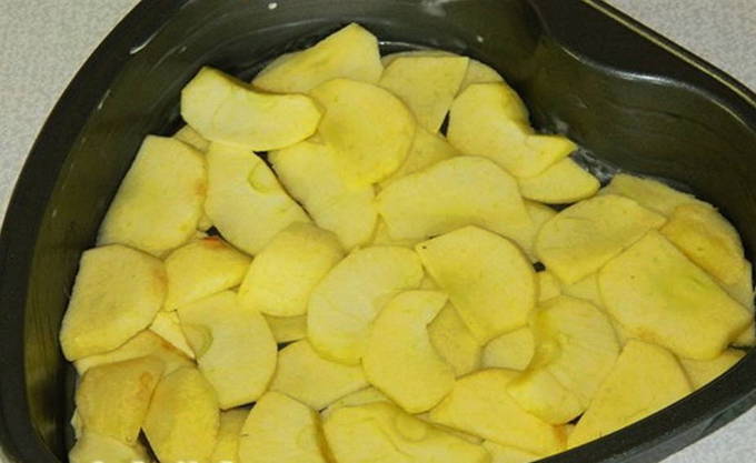 Schil 4 appels, snijd de zaaddoos eruit en snijd ze in willekeurige stukjes of plakjes - leg de helft van het fruit op de bodem van de ovenschaal, eerder ingevet met een stuk boter.
