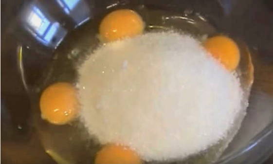 Om het deeg te bereiden, breek je twee eieren in een diepe kom, voeg je kristalsuiker toe en klop je met een garde of mixer.