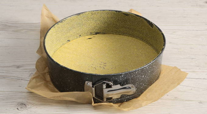 - Om ervoor te zorgen dat de afgewerkte cake niet verbrandt, moet de ovenschaal als volgt worden bereid: bestrijk de bodem en zijkanten met boter (ongeveer 20 gram) en bestrooi met paneermeel of griesmeel erover.
