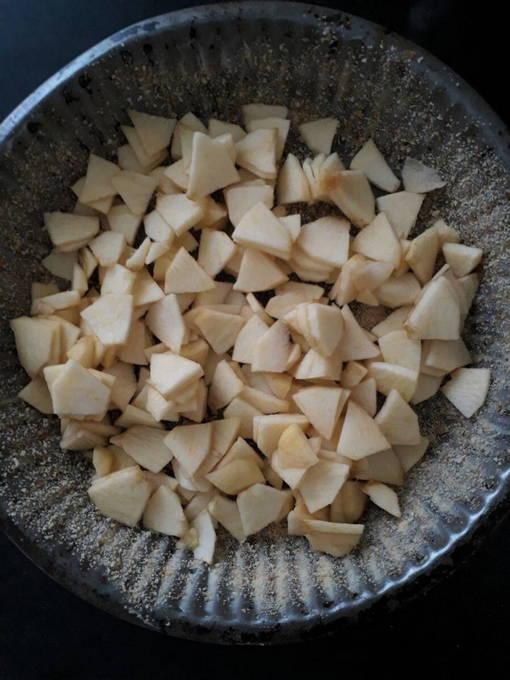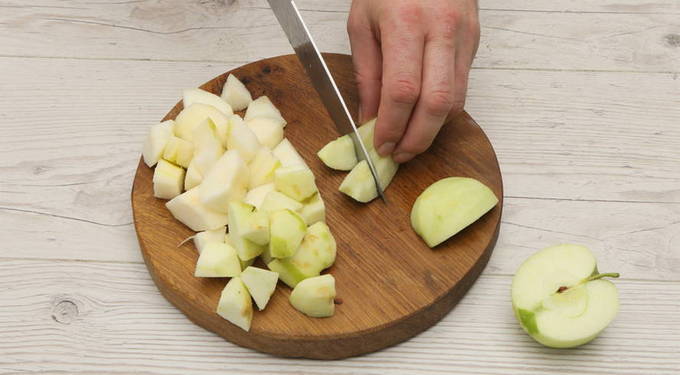 - Schil het fruit, snijd het klokhuis eruit en hak het op een of andere manier fijn. Leg de appelblokjes op de bodem van de vorm.