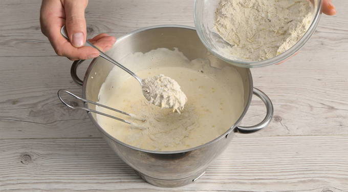 Giet vervolgens de gezeefde en geoxygeneerde bloem in de eiermassa.