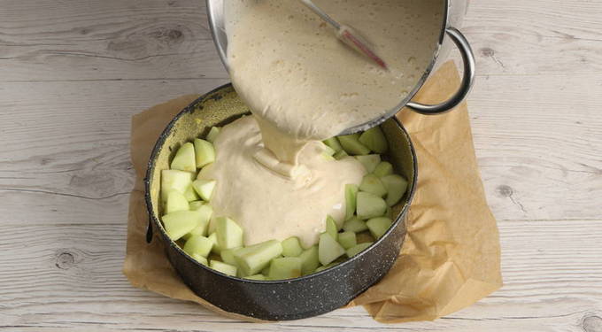 Vul de appelschijfjes met de helft van het deeg, leg het fruit opnieuw neer en "sluit" de rest van het ei-bloemmengsel - we vormen twee lagen.