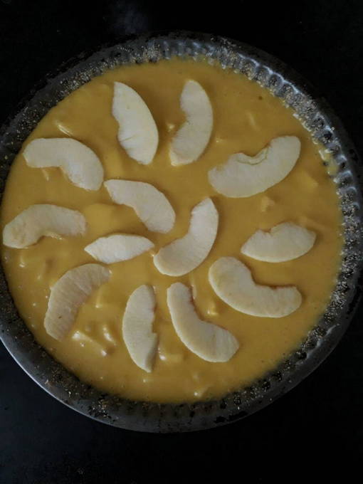- Bestrijk de ovenschaal met boter, giet het koekjesdeeg erin en leg de fruitplakken mooi neer. We koken ongeveer 40 minuten in de oven op een temperatuur van 180 graden.