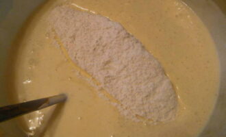 - Voeg geleidelijk gezeefde bloem en bakpoeder toe aan de resulterende massa.