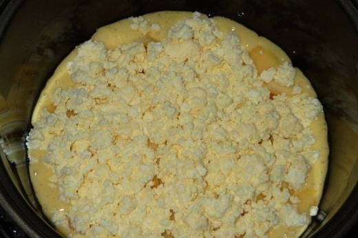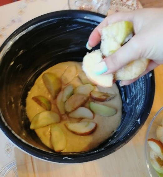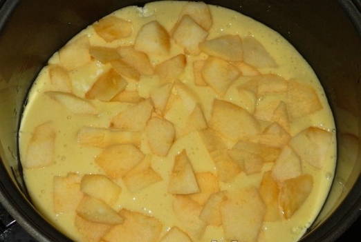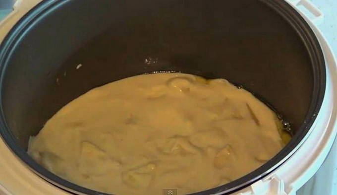 - Meng de appelstukjes en het deeg met elkaar en giet in een slowcooker. Koken in de modus "Bakken" gedurende 65 minuten.