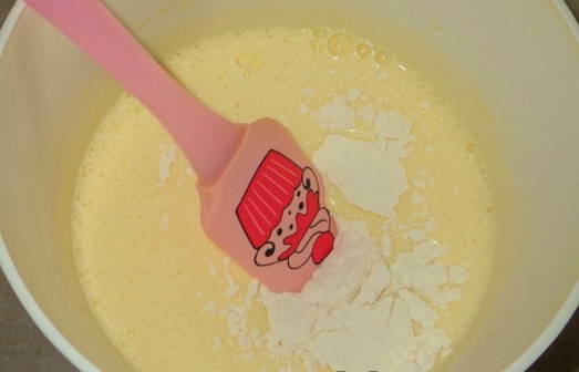 - Zeef de tarwebloem en combineer met een bakpoeder, giet het resulterende bulkmengsel in de eiermassa en roer met een spatel.