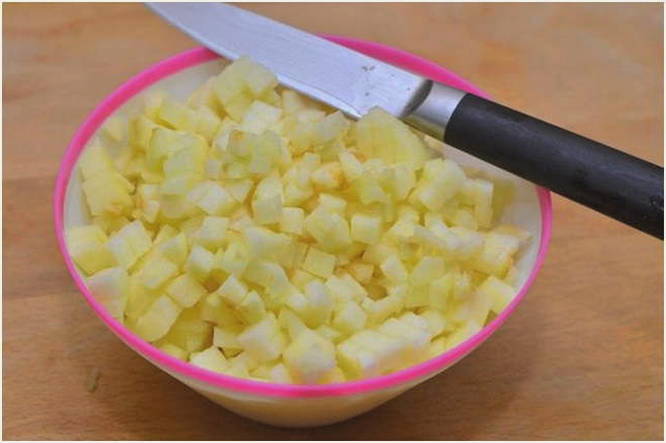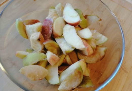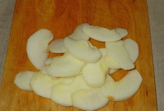 - Spoel twee middelgrote appels onder stromend water, droog, verwijder de zaadcapsule en snijd in dunne plakjes. Roer met een houten spatel en zorg ervoor dat u het hoofdbestanddeel van de vulling niet breekt.