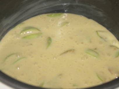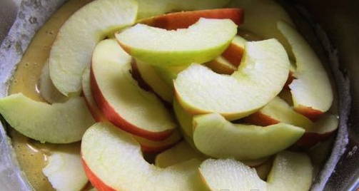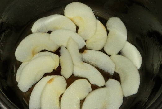 - We bestrijken de capaciteit van de multikoker royaal met boter en spreiden de appels, in dunne plakjes gesneden, op de bodem.