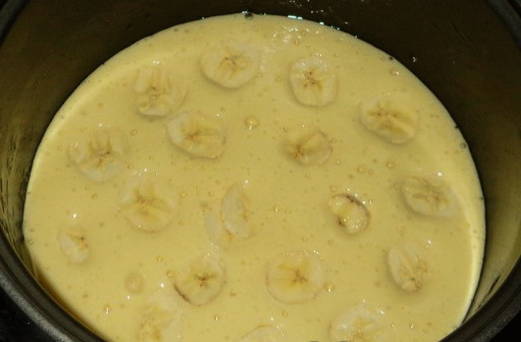 - Giet het koekjesdeeg over de appelschijfjes en leg de banaan erop. We bakken een uur op het programma "Bakken".