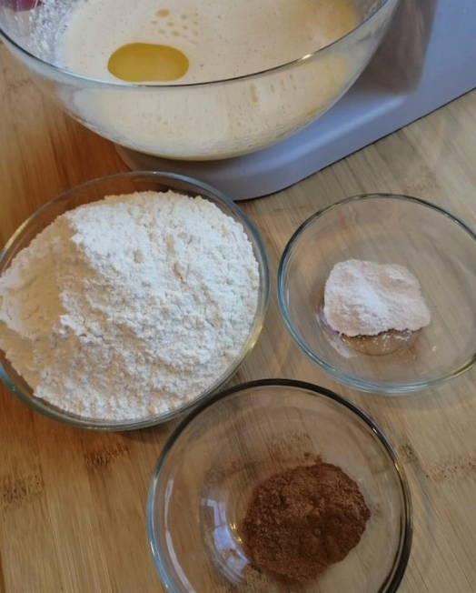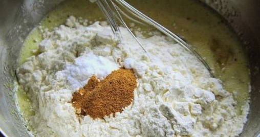 - Voeg bloem, kaneel en een theelepel frisdrank toe aan het ei-suikermengsel - goed mengen.
