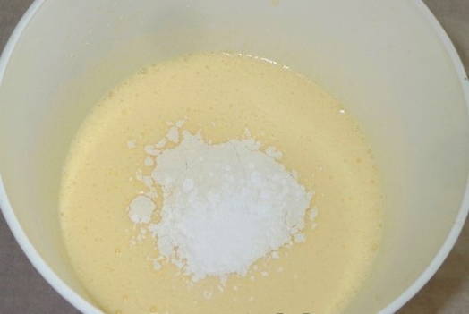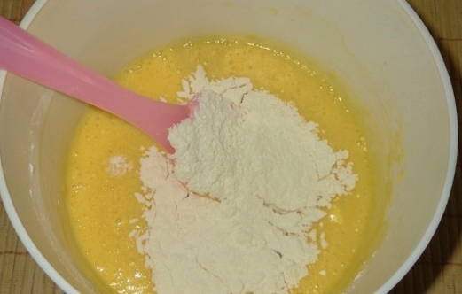 Voeg ook, aan de eiermassa, blijven kloppen, bloem in kleine porties toe en vervolgens bakpoeder.