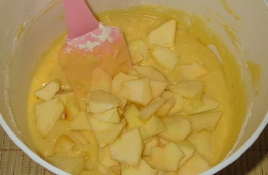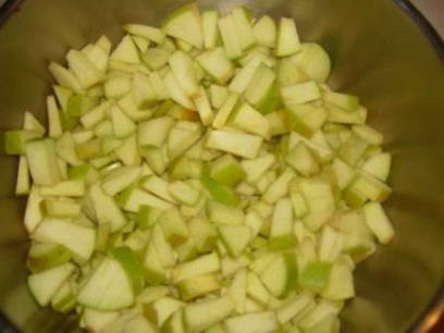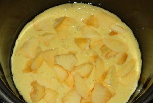 - Verwijder de schil van de appels, snijd de zaden eruit en snijd ze in stukjes - combineer met het deeg en doe in de kom van de multikoker, eerder ingevet met een kleine hoeveelheid plantaardige olie.