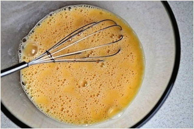 - Laten we een deeg nemen.Drijf de eieren in een diepe kom, voeg een snufje zout toe en klop tot ze schuimig zijn met een mixer of een garde.