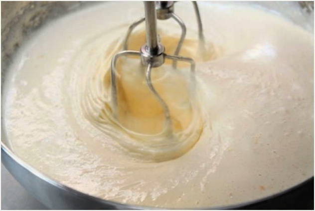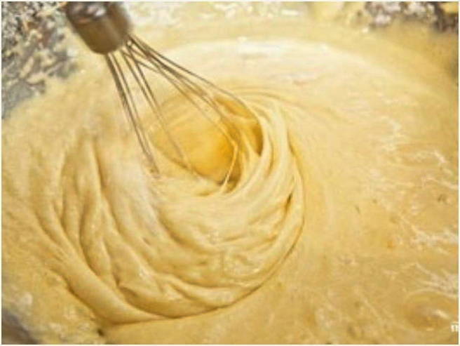 - Meng de basis van de toekomstige cake opnieuw, maar deze keer is het beter om een houten spatel te gebruiken en in één richting te roeren.