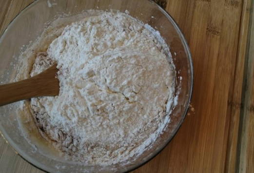 - Voeg aan de resulterende massa geleidelijk gezeefde tarwebloem toe samen met een bakpoeder.