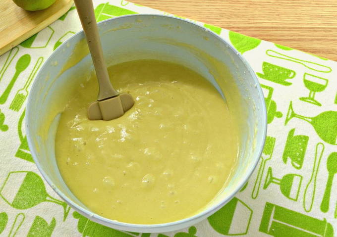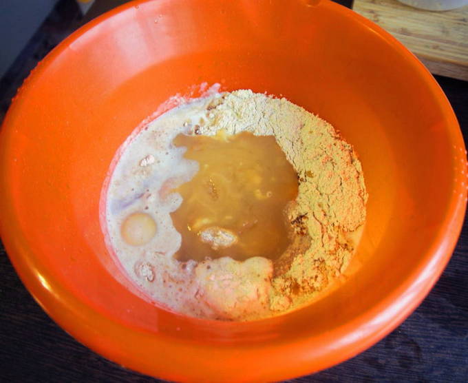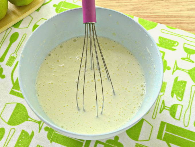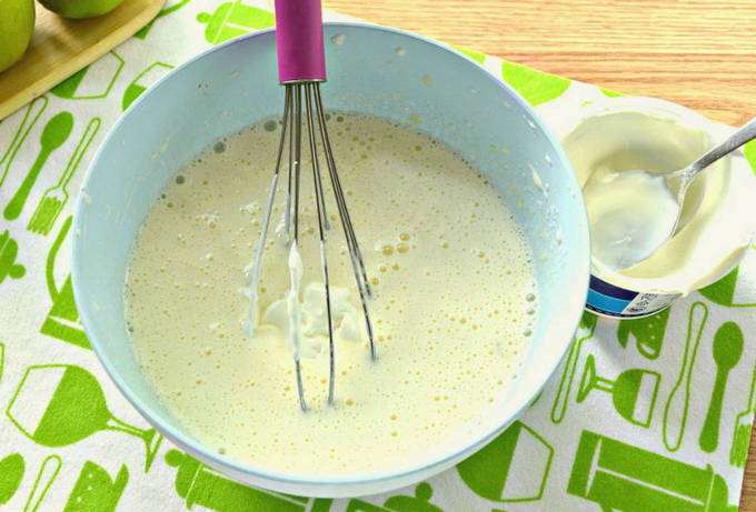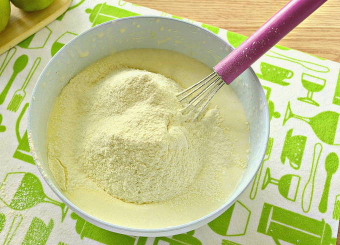 - Bereid het deeg: combineer in een diep bord haver- en volkorenmeel, ei, eiwitten, appelmoes en kristalsuiker - roer grondig en voeg kefir toe samen met bakpoeder - mix tot een gladde massa.