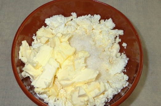 - Meng in een aparte container de kwark, de resterende suiker en een stuk boter - roer tot een gladde massa.