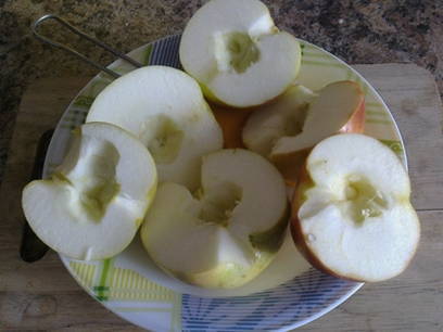 - De vulling voorbereiden. Spoel de appels grondig af onder stromend water, droog ze af met keukenpapier, halveer ze en verwijder de zaadcapsule.