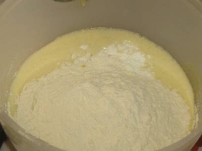 - Voeg verder, zonder de mixer uit te zetten, geleidelijk tarwebloem en bakpoeder toe.
