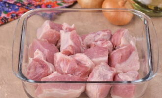 Spoel het varkensvlees grondig onder stromend water, droog het af met keukenpapier en snijd het in voldoende grote stukken (terwijl witte films en strepen worden verwijderd).