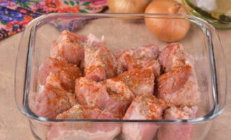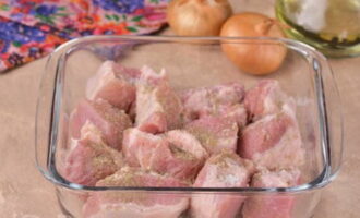 - Spoel het varkensvleespulp goed af onder stromend water, droog het en snijd het in stukken van maximaal 5 bij 5 centimeter. Snijd de ui in ringen die dik genoeg zijn en stuur deze naar het vlees, besprenkel het royaal met je favoriete kruiden, zout, peper en zet opzij om minstens een uur in je eigen sap te marineren.