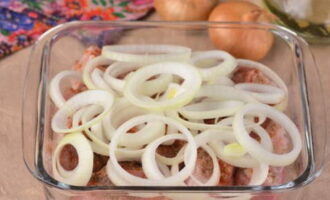We schillen een paar uien en snijden ze in ringen van gemiddelde dikte, leggen ze op het hoofdbestanddeel.