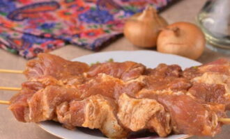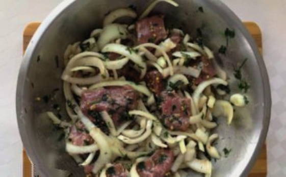 - We weken de spiesen vooraf in koud water en leggen er een stuk vlees, ui en opnieuw vlees op - we wisselen af.