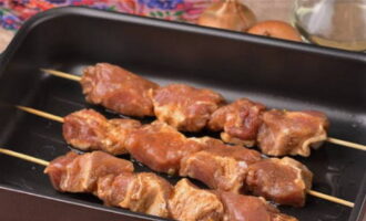 Terwijl het varkensvlees verzadigd is met kruiden, weken we de houten stokjes in water zodat ze niet verbranden in de oven. We planten de ingelegde pulp direct op de vochtige spiesen.