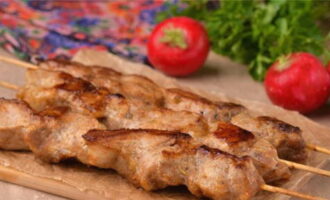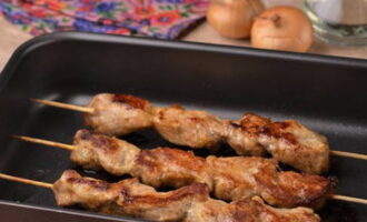- We brengen de kebabs over naar een ovenschaal of op een bakplaat en sturen ze 20-25 minuten naar de oven bij een temperatuur die niet hoger is dan 180 graden.