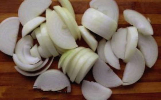 - Schil de ui en snijd in dikke ringen - stuur het naar de kip.