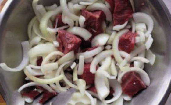 - Snijd het vlees in stukken van dezelfde grootte van maximaal 5 centimeter en vul met wijnmarinade, laat 25-30 minuten weken.