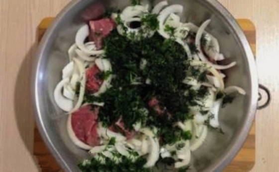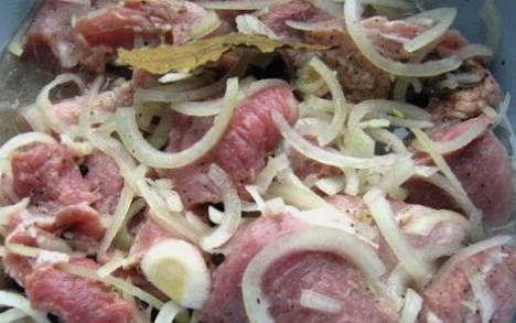 - Snijd het vlees in kleine stukjes, breng op smaak met kruiden, zout, giet de resterende azijn en citroensap erbij. We mengen alle ingrediënten met onze handen en sturen ze na de uien minimaal 6 uur naar de koelkast.