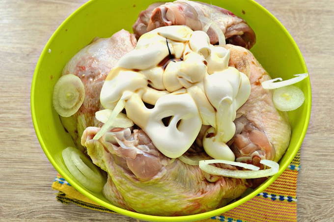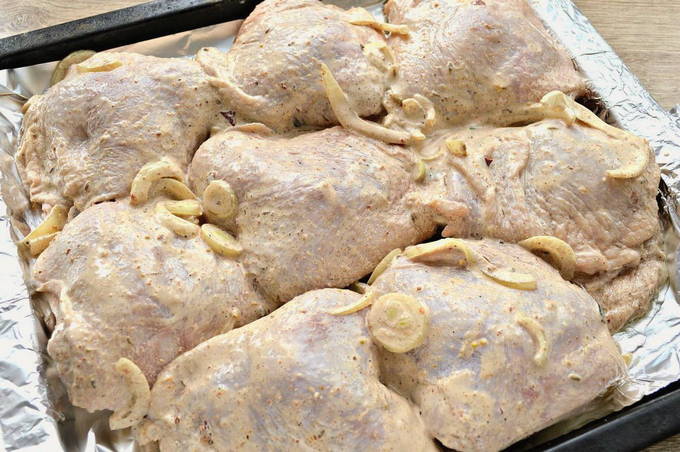 - Bestrooi de dijen met uien met uw favoriete kruiden royaal en vergeet niet te zout. Meng alle ingrediënten goed door elkaar en zet ze minimaal 2 uur in de koelkast om te laten weken.