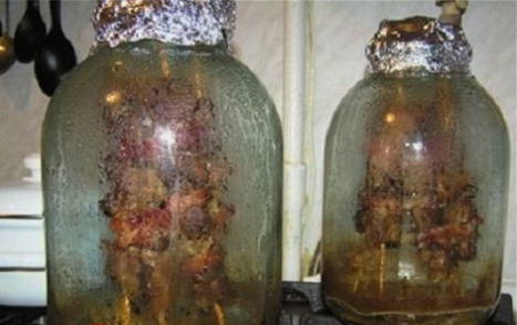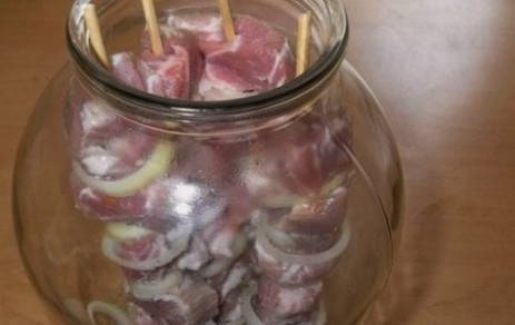 - Na verloop van tijd leggen we de stukjes op houten spiesen en leggen ze op de bodem van een pot van drie liter, die is voorgevoerd met uienringen.