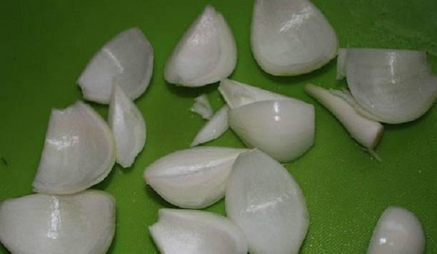 - We schillen een paar uien en snijden ze in 4 delen, verdelen elke plak in een soort "bloemblaadjes" en voegen toe aan de vleesbereiding.