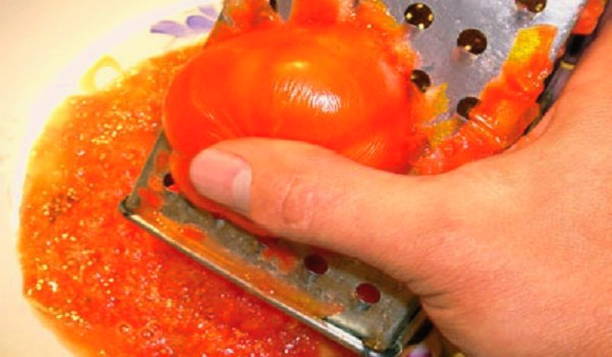 - Grote sappige tomaten worden "van de schil bevrijd en geraspt, waarna we de pap naar de reeds bereide ingrediënten sturen.