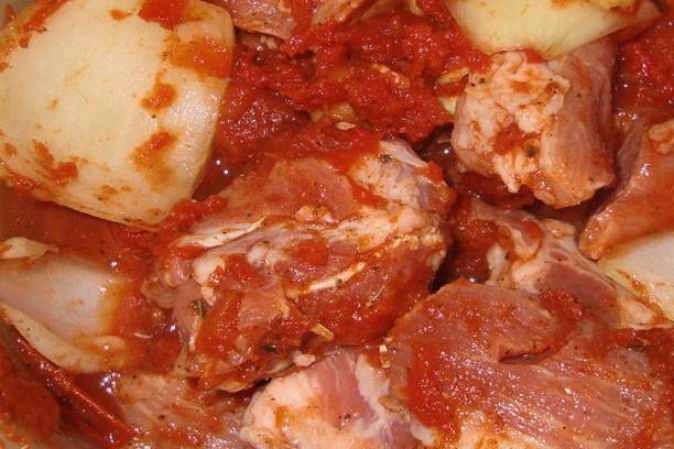 - We mengen alle ingrediënten grondig met elkaar en laten het varkensvlees gedrenkt in kruiden en tomatenpuree.