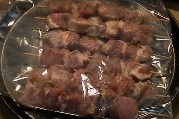 - We verspreiden de "spiesjes" op een bakplaat bedekt met folie en sluiten ook de bovenkant, zodat het vlees niet verbrandt en niet uitdroogt.