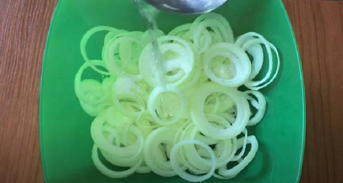 - Schil de ui en snijd in ringen van ongeveer 0,3-0,4 millimeter breed. Kneed voorzichtig met je handen en voeg een eetlepel kristalsuiker, twee eetlepels azijn, zout en water toe. Meng goed en zet in de koelkast om te marineren.