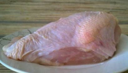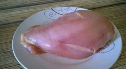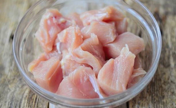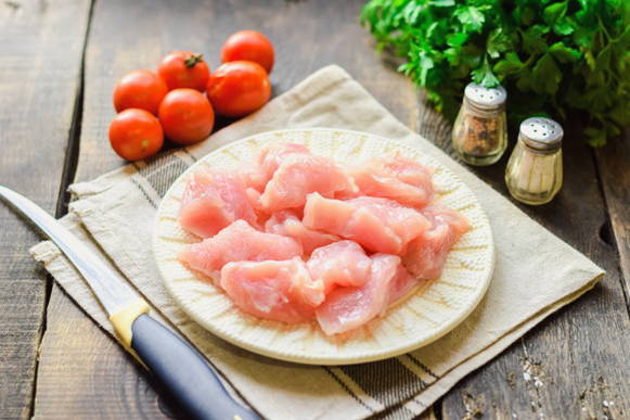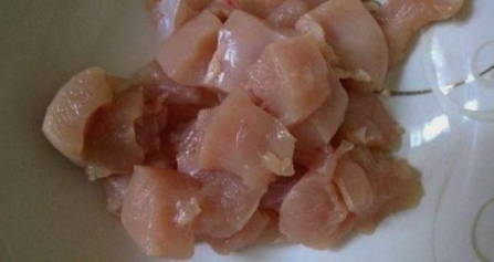 - Verse kalkoenfilets afspoelen (bevroren vlees mag niet worden gebruikt), onder stromend water afspoelen, deppen met keukenpapier en in kleine stukjes snijden.